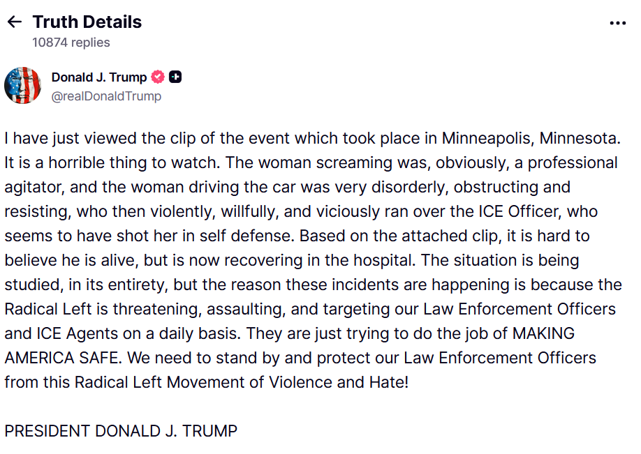 When confronted directly with footage of the murder, through journalists, he double-downed on his initial claims that it was Good's intent to run over her murderer, even when shown the footage again at that same press event, implying that Good brought her murder upon herself, Trump later remarking, "you're supposed to listen to law enforcement."