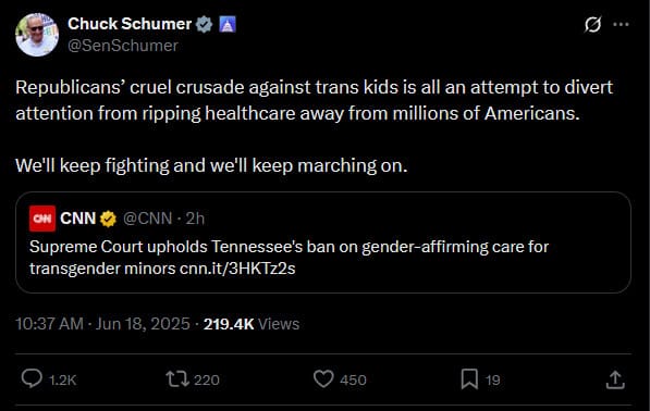 Chuck Schumer's team tweeted the following on the 18th of June in regards to trans kids being diversion over the health of millions of Americans.