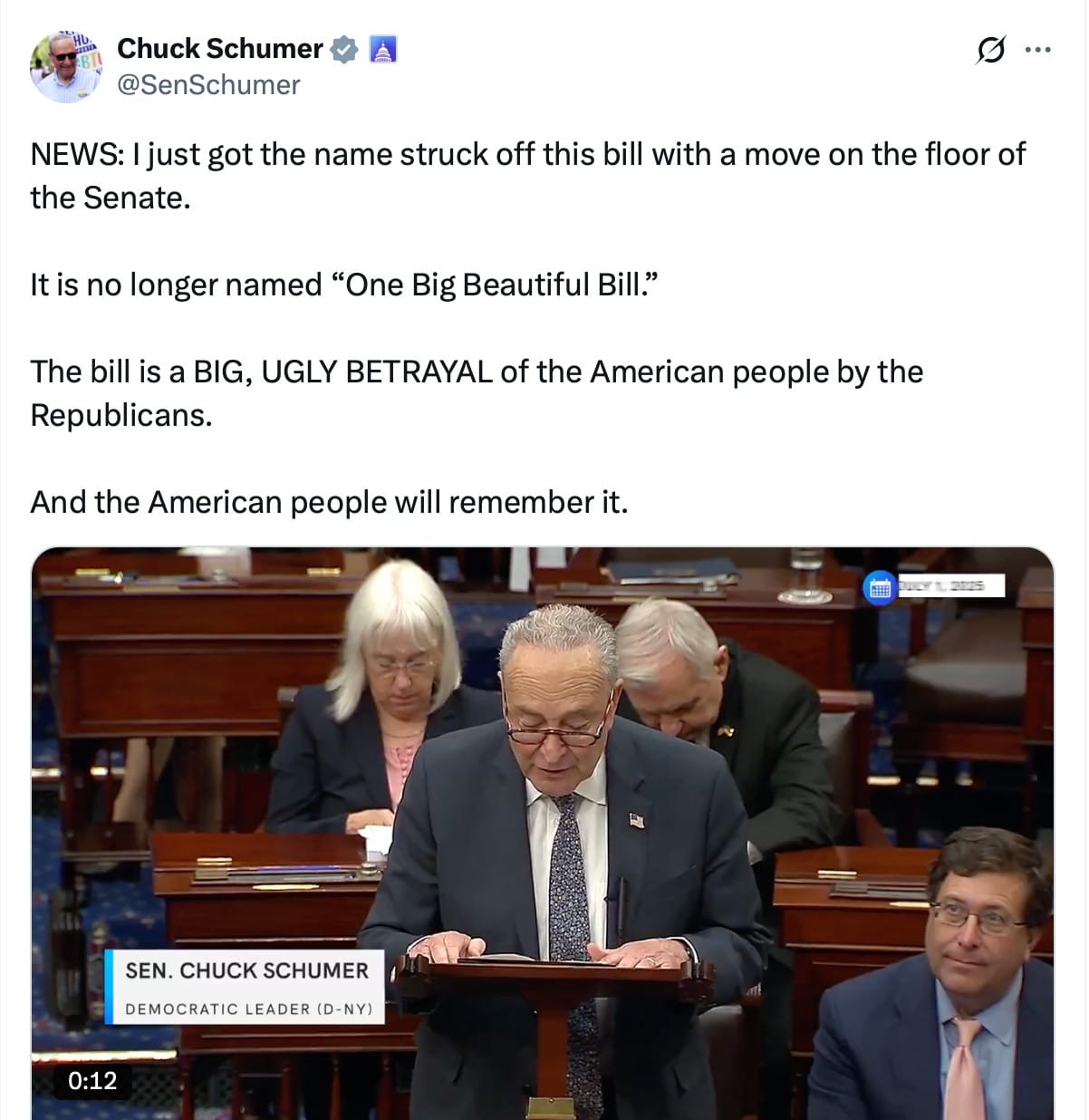 Chuck can at least be proud knowing he was able.... to officially change the name of Trump's "Big Beautiful Bill" ... I guess he can pat himself on the back. I know I won't.